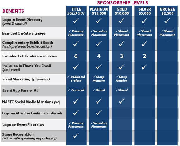 Sponsorships will get you a listing in the conference marketing material that all attendees will receive, recognition on the conference digital signage, more visibility in the NASTC 4th quarter newsletter, and on-site signage for applicable sponsorships.